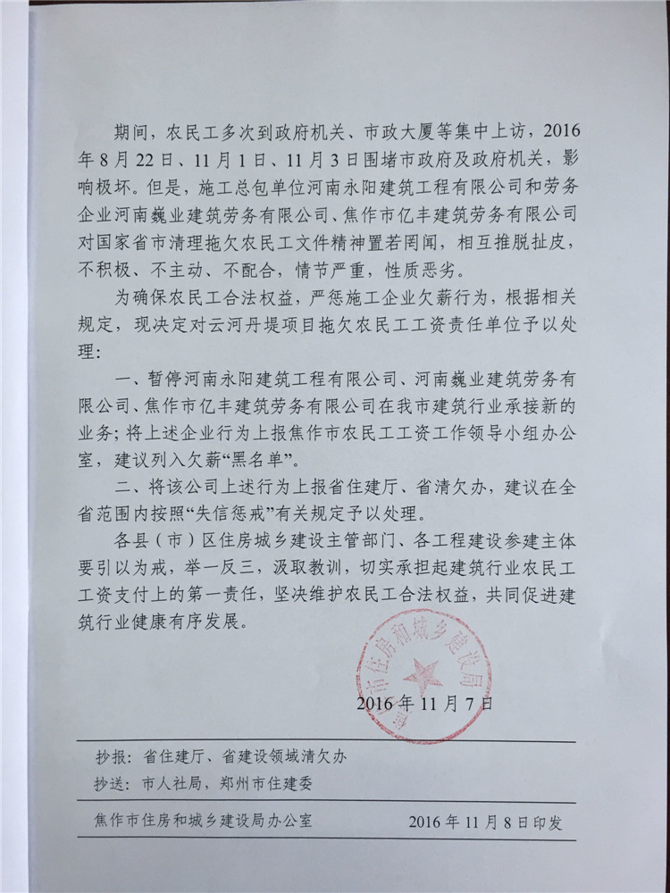 焦作市住房和城鄉(xiāng)建設(shè)局關(guān)于對云河丹堤項目拖欠農(nóng)民工工資責(zé)任單位予以嚴(yán)肅處理的通報